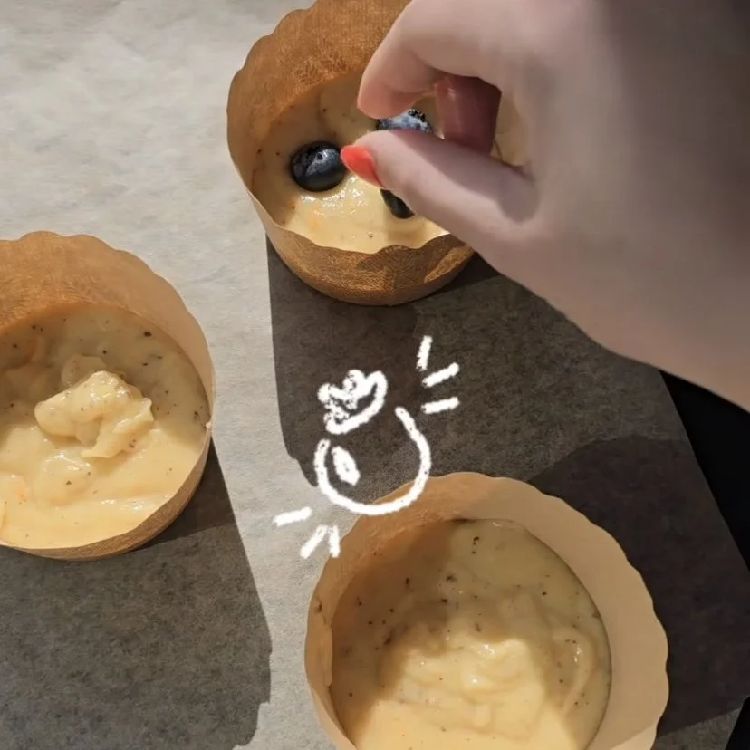 In a muffin tray or standalone muffin liners, spoon out an even amount into each cup. Afterward, drop a few blueberries into every one!